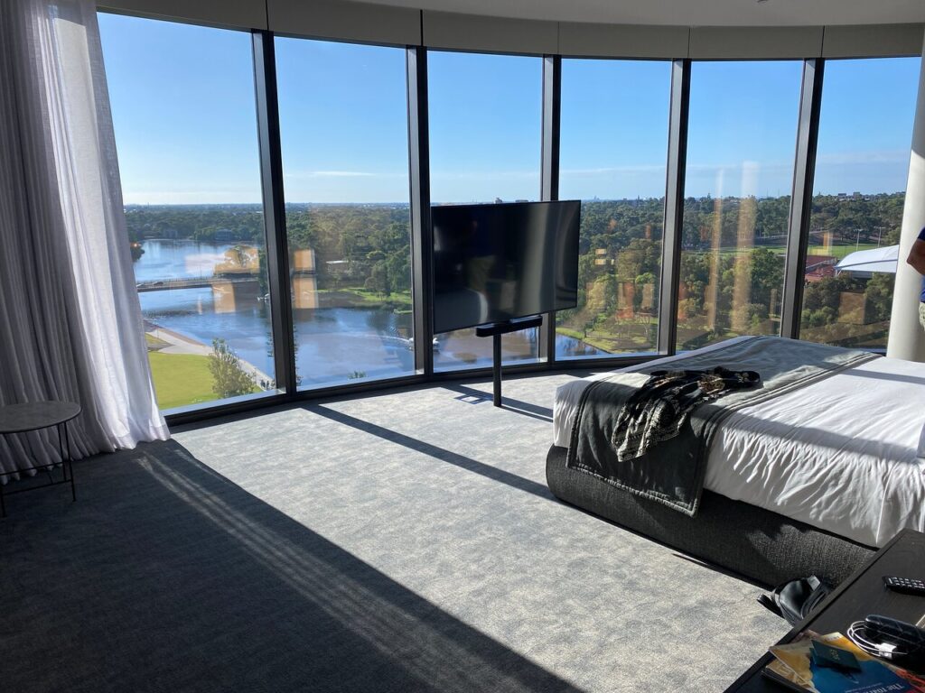 A spacious luxury suite with sweeping River Torrens views, elegant interiors and a marble bathroom, designed for relaxation, style and pure indulgence.